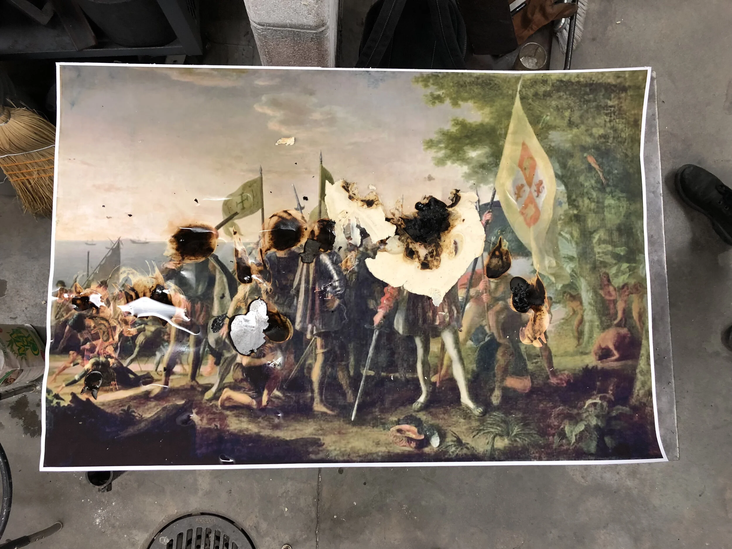 This piece is a collection of remnants from a performance where I took an iconographic painting of Christopher Columbus and burned the faces of colonizers in the painting with hot glass. These three iterations - video, physical remnant, and zine - parallel each other in the ways they represent the action of burning a colonizer. One can take a paper boat and unfold - thus destroying a colonizer's ship - and opening it to reveal a zine with instructions for the decolonizing ritual I perform. In the act, I first make a tortilla by hand and slap it on Columbus's face, as to show that this gastronomical craft exists in spite of settler colonial violence, here to punch a colonizer in the face with 500 years of intergenerational trauma.